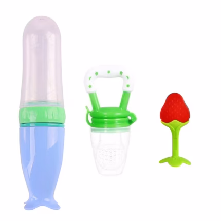Set hranire copii Lingurita din silicon cu rezervor pentru diversificare albastru, Suzeta pentru fructe si legume verde, jucarie dentitie rosie, silicon