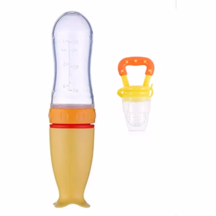 Set hranire copii Lingurita din silicon cu rezervor pentru diversificare galben, Suzeta pentru fructe si legume galben, jucarie dentitie portocala, silicon