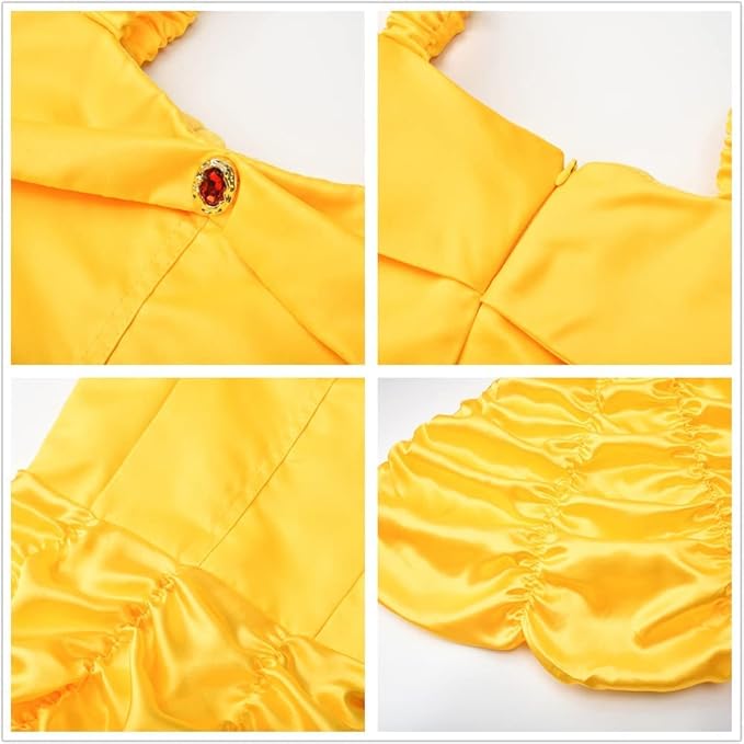 Rochia este confectionata din material satinat lucios, intr-o nuanta intensa de galben auriu. Bustul are un design simplu, cu bretele delicate si o aplicatie de bijuterie rosie in centru, care adauga un plus de stralucire. Fusta ampla este bogat drapata in falduri, imitand perfect rochia purtata de Belle la balul din castel, oferind volum si un efect spectaculos in miscare.