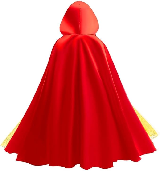 Pelerina rosie cu gluga – realizata din material fluid si moale, aduce un plus de mister si eleganta. Se prinde cu o funda mare, rosie, sub gat, accentuand farmecul printesei si protejand-o de frig in serile de poveste.