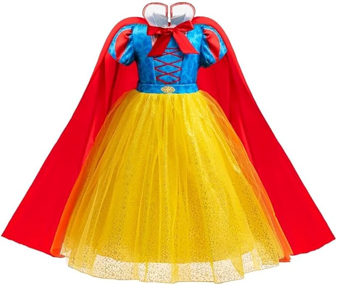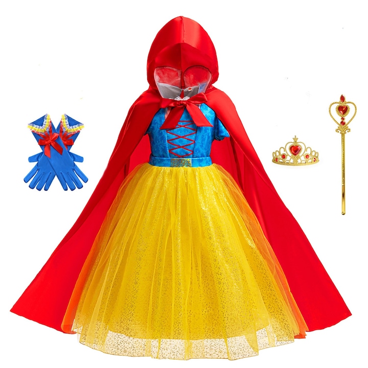 Rochia – partea superioara are un design regal, cu nuante de albastru intens si snur rosu decorativ, amintind de vestimentatia clasica a frumoasei printese. Talia este evidentiata de o panglica satinat-lucioasa, iar fusta ampla este confectionata din mai multe straturi de tul galben stralucitor, presarat cu sclipiri aurii delicate, oferind volum si un efect feeric la fiecare pas.