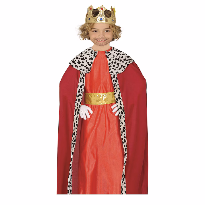 Costum copii Craciun Mag rosu, cu coroana contine roba cu centura aurie, pelerina rosie cu margini alb cu negru, coroana.