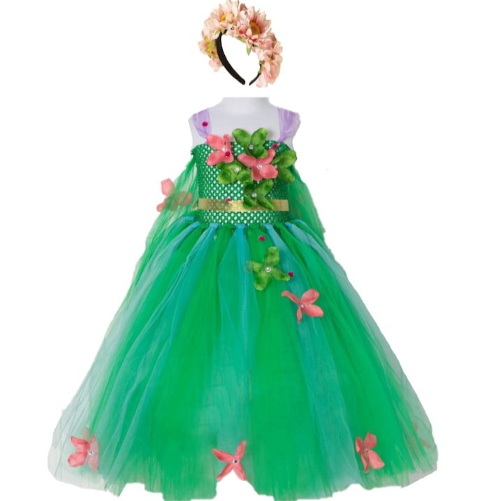 Costumul este accesorizat cu o bentita cu flori, perfecta pentru a completa transformarea intr-o zana a naturii. Materialele usoare si vaporoase creeaza volum si un efect spectaculos in miscare.