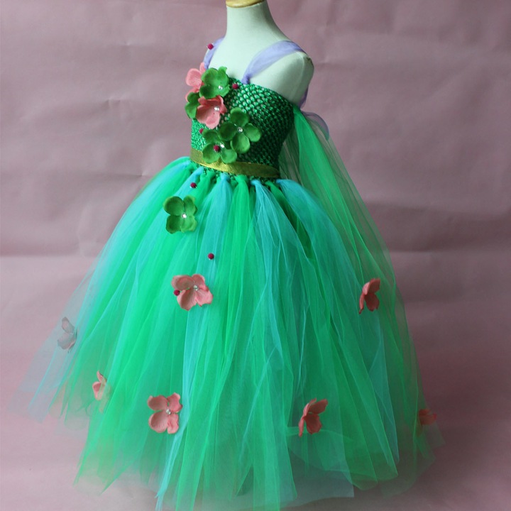 Acest costum delicat de Zana a Primaverii este inspirat de frumusetea naturii inflorite. Rochia are o fusta ampla din tul in nuante de verde si turcoaz, care aminteste de iarba proaspata si de culorile vii ale primaverii.