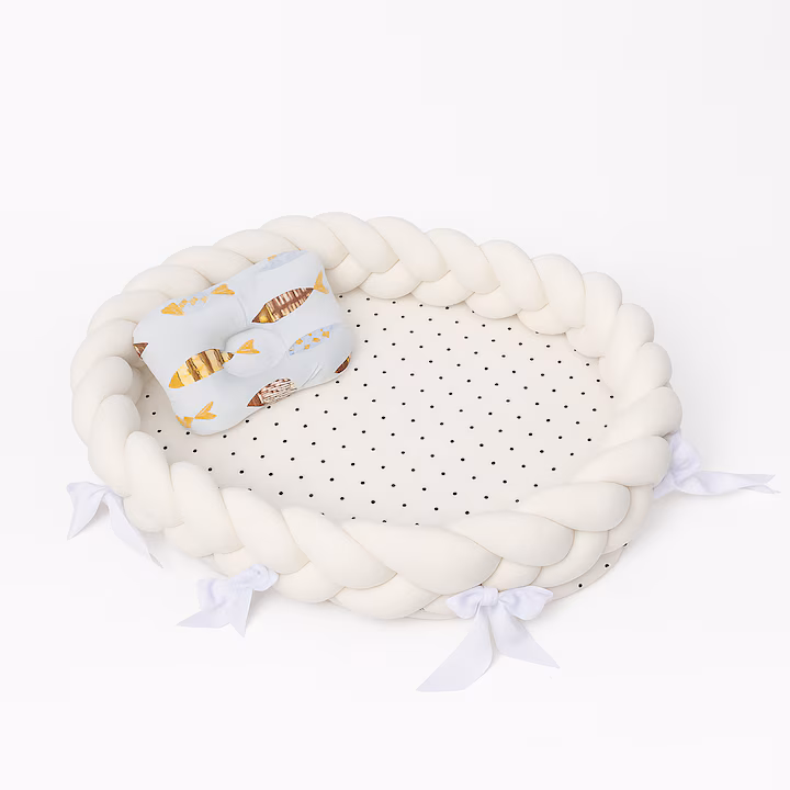 Cosulet cu perna cu pestisori pentru bebelusi, portabil, margini impletite Bumper, bumbac, alb