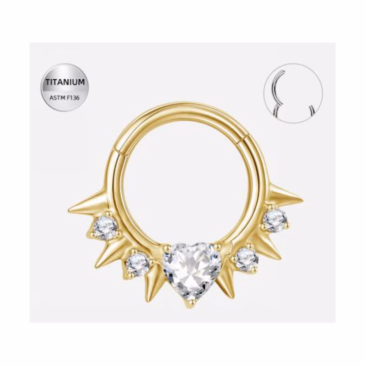 Acest inel elegant, realizat din titanium ASTM F136, imbina perfect delicatetea si stilul modern. Piatra centrala in forma de inima este inconjurata de patru pietre clear rotunde, toate accentuate de detalii aurii tip spike, care ofera un aspect indraznet si rafinat in acelasi timp.