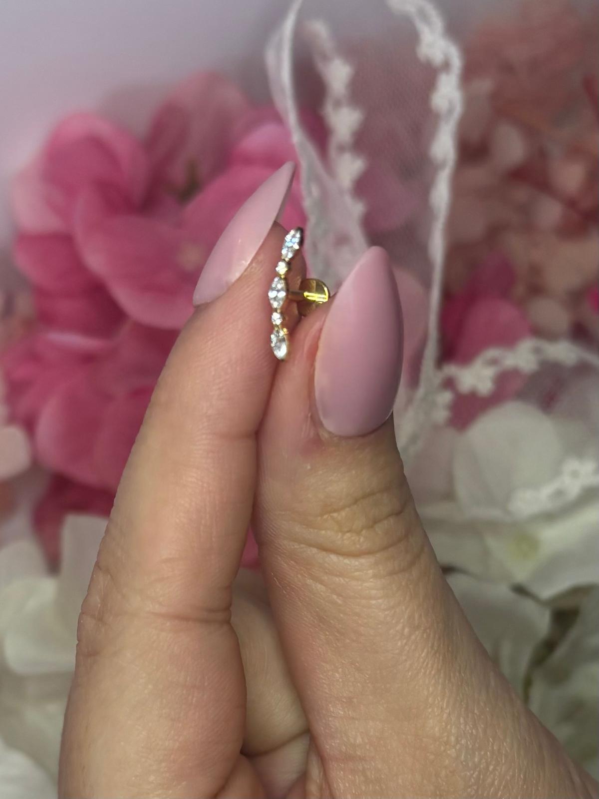 Perfect pentru helix, flat sau lobe, acest piercing oferă un look delicat, dar în același timp luxos. Forma alungită urmează frumos linia urechii, accentuând eleganța.0