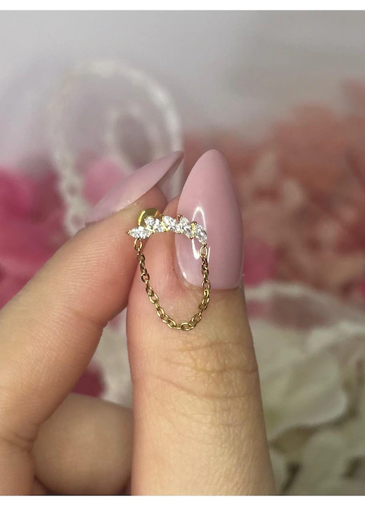 Acest labret sofisticat, realizat din titanium ASTM F136, imbina eleganta pietrelor marquise cu delicatetea unui lantisor fin, creand o bijuterie moderna si extrem de feminina. Cele cinci pietre clear, dispuse in linie curbata, ofera o stralucire intensa, iar lantisorul atasat adauga un efect decorativ unic si fluid.