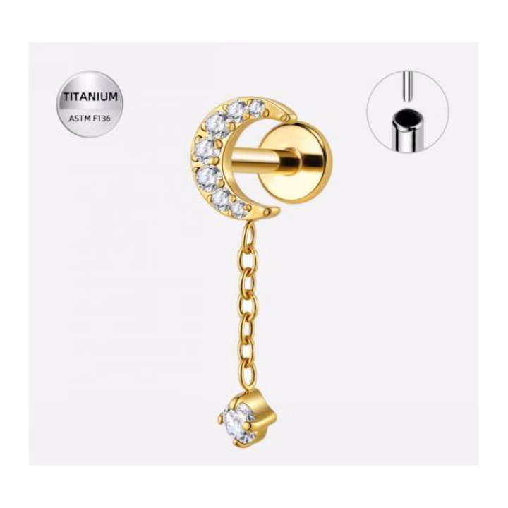Piercing Labret Titan ASTM F136 Auriu cu Luna & Lantisor – 1.2 × 8 mm