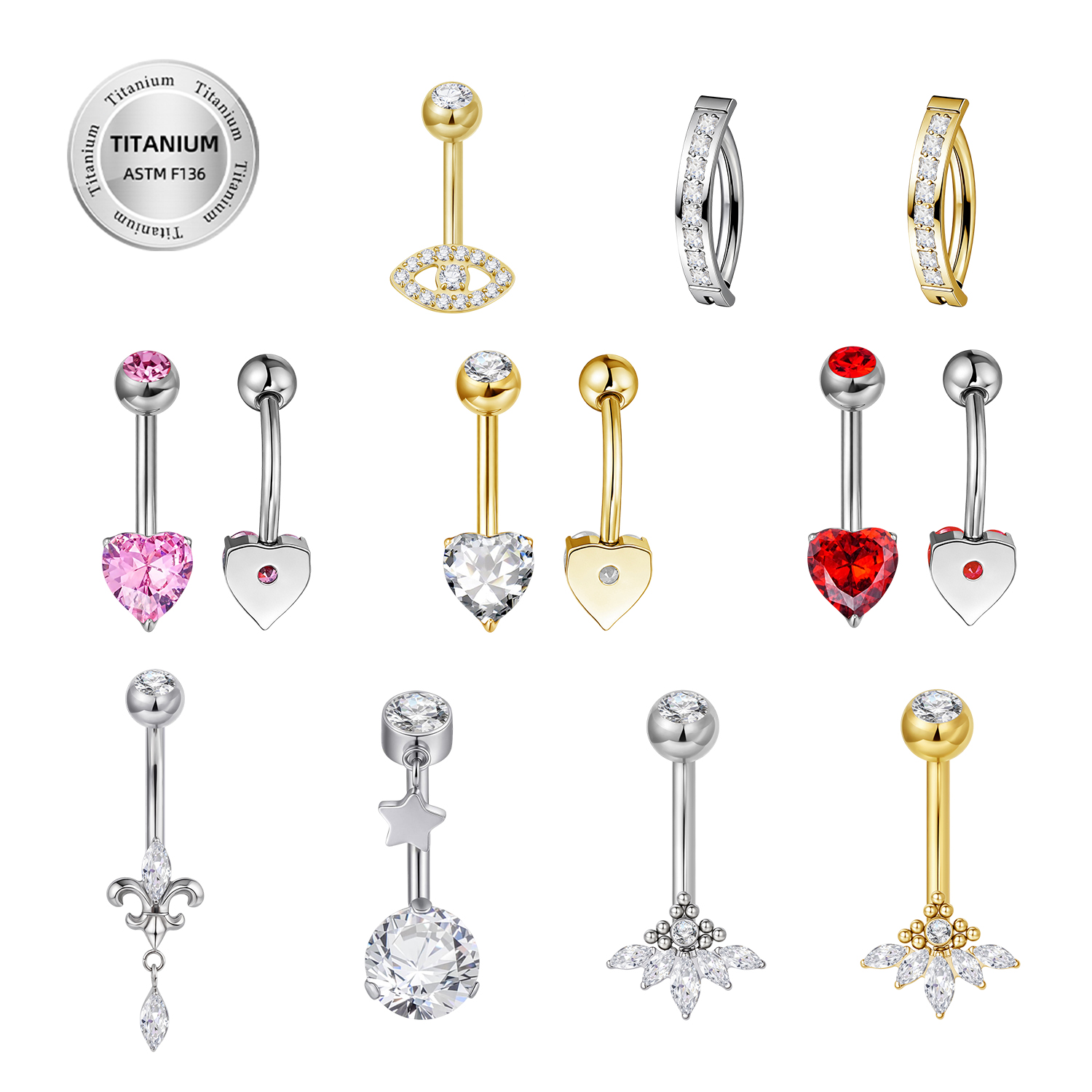 Piercing pentru buric realizat din titan ASTM F136, placat în nuanță aurie, cu un design sofisticat inspirat din stil regal. Partea superioară este decorată cu un cristal rotund strălucitor, iar în partea inferioară se regăsește un motiv ornamental elegant, evidențiat de un cristal tip marquise (formă de frunză).