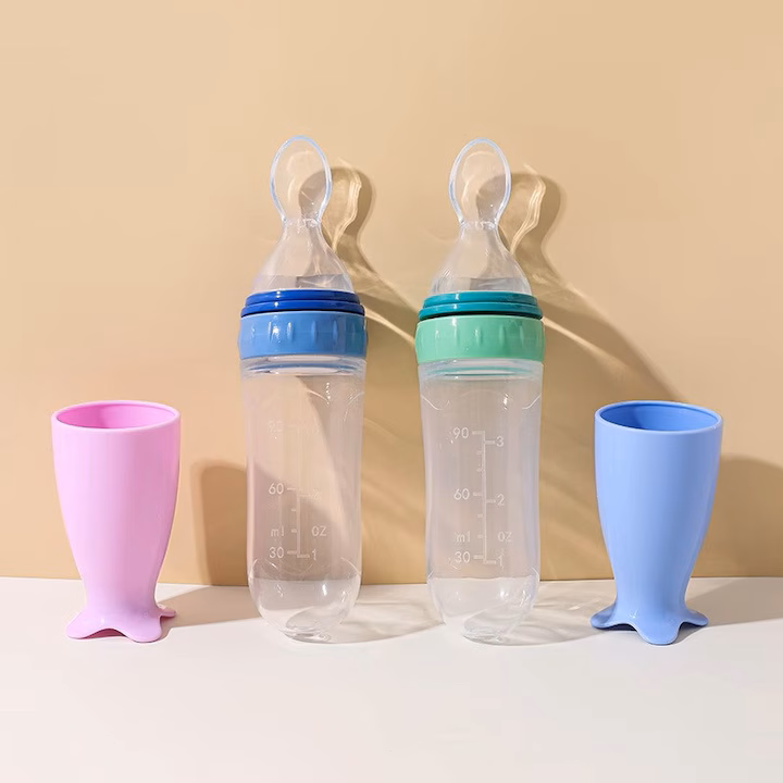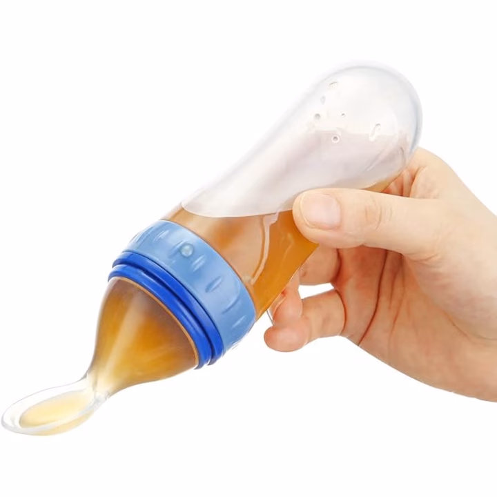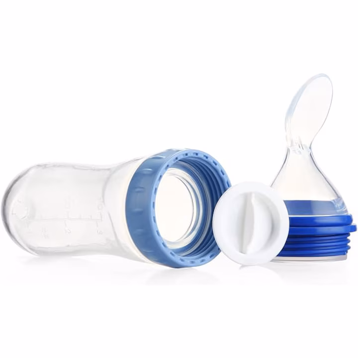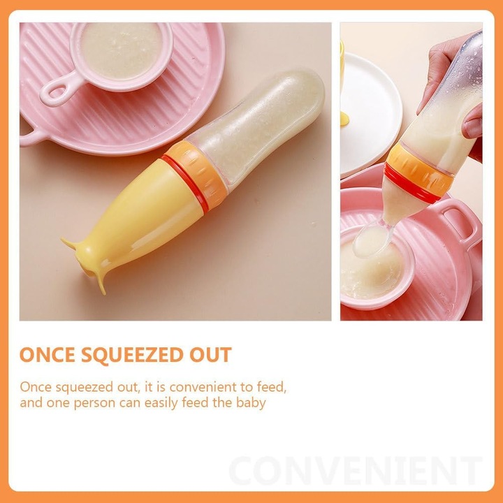 Mecanism de stoarcere: se apasa usor corpul biberonului pentru a impinge continutul direct in lingurita.