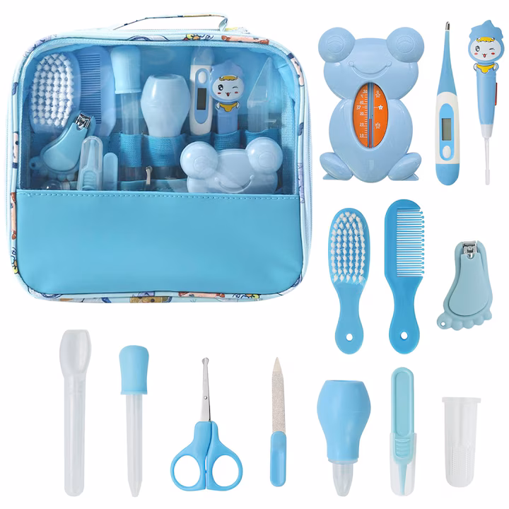 Set pentru ingrijirea copilului, 13 accesorii, cu suport portabil, culoare albastra